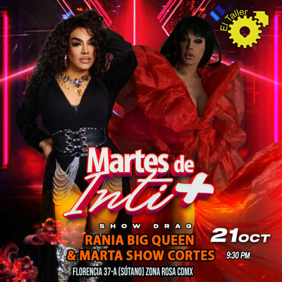 9:30 pm. Show Drag MARTES DE ÍNTI+ con RANIA BIG QUEEN invitada MARTHA CORTEZ.